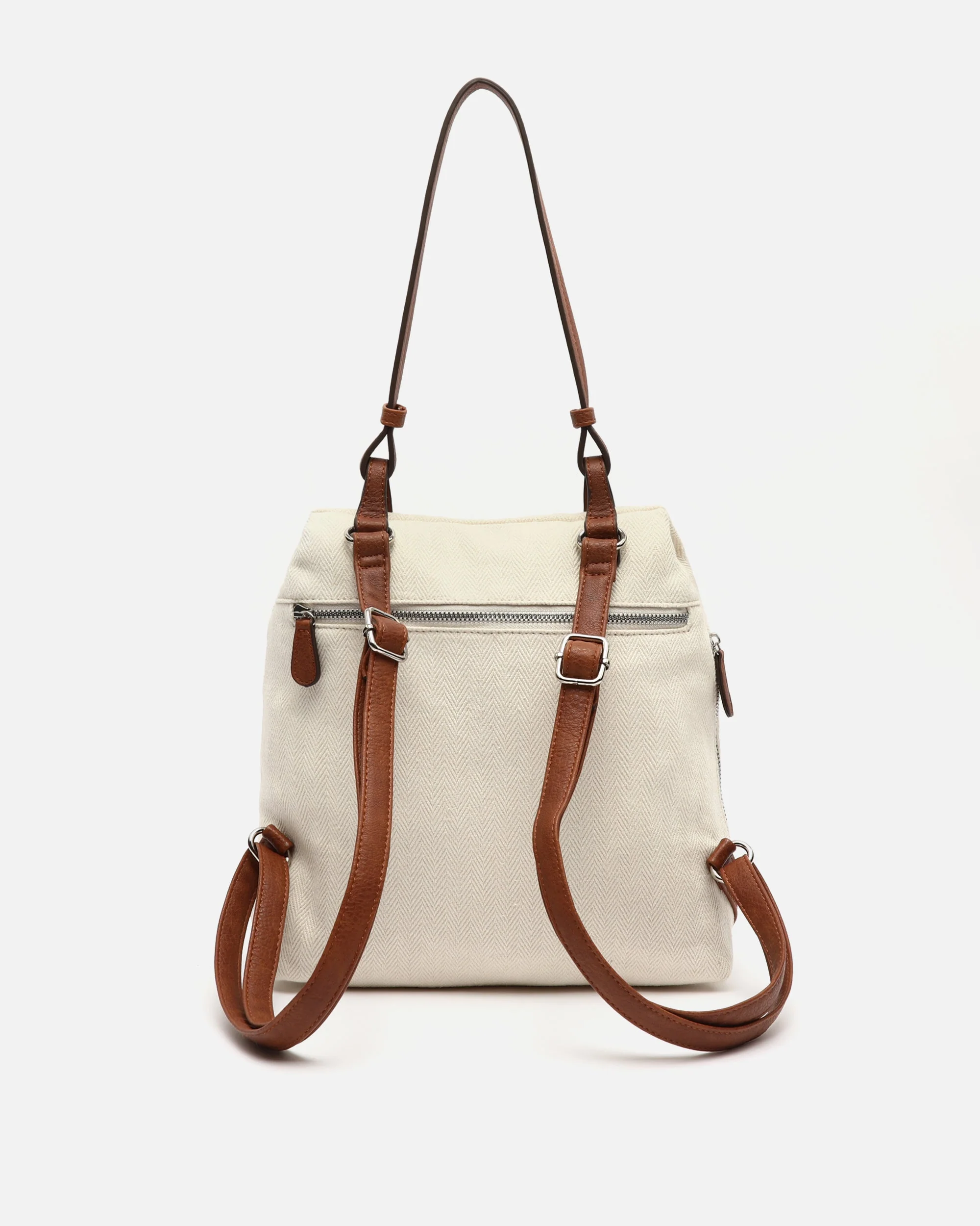 Fabricada en una combinación de tejidos de gran calidad y acabados en efecto piel que le aportan elegancia. Su cierre principal está estratégicamente ubicado en la parte posterior para ofrecer mayor protección, mientras que sus cremalleras metálicas, bolsillos exteriores y tiradores largos aportan comodidad y organización. Las asas permiten llevarla con total confort al hombro o en la espalda, adaptándose a rutinas activas o escapadas de fin de semana.Â