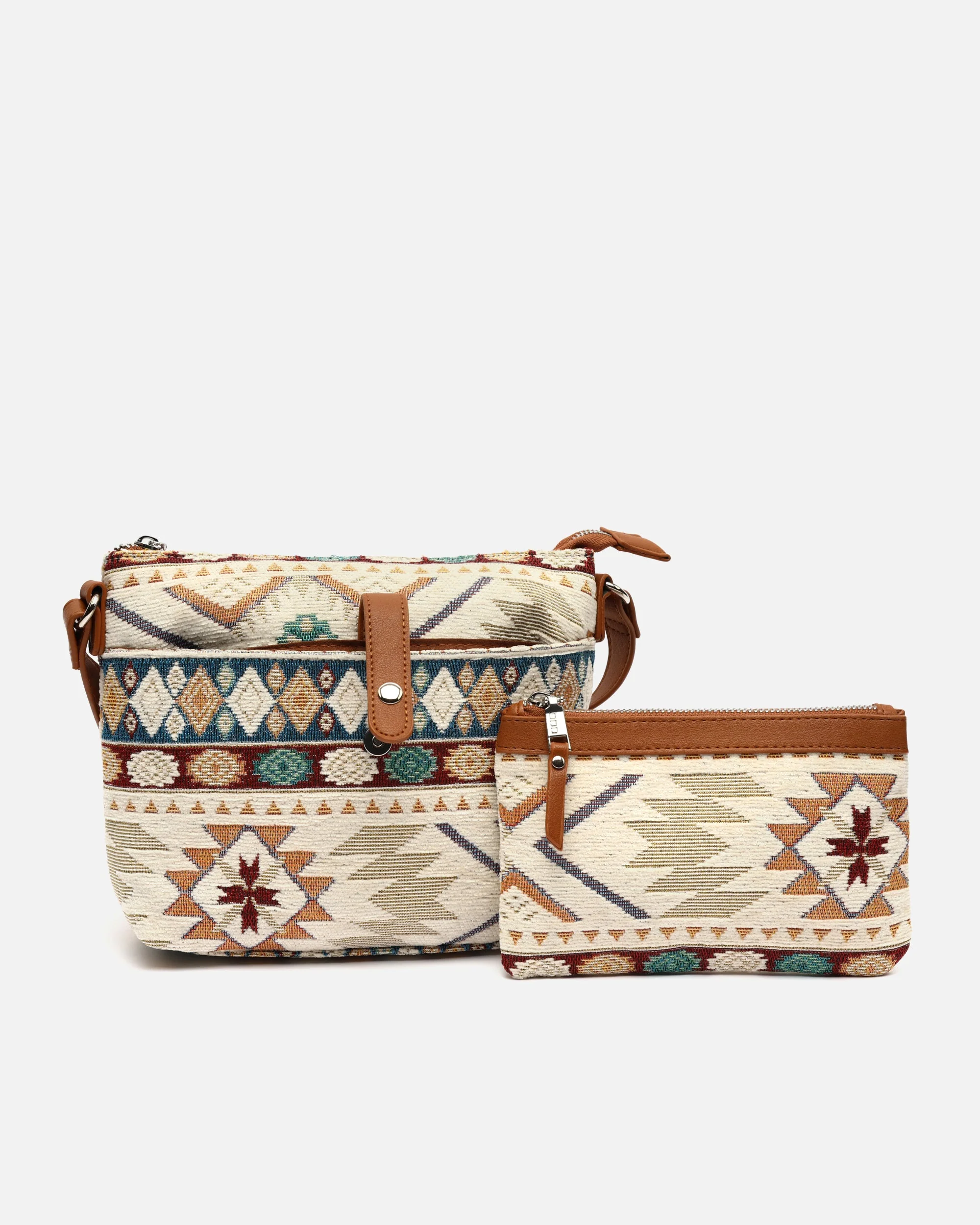 Ideal para escapadas de fin de semana o looks relajados de entretiempo y verano, Tiani de Misako es un bolso bandolera compacto con inspiración artesanal. Su estampado jacquard en tonos tierra con motivos étnicos aporta textura, calidez y un aire boho que suma personalidad a cualquier look.